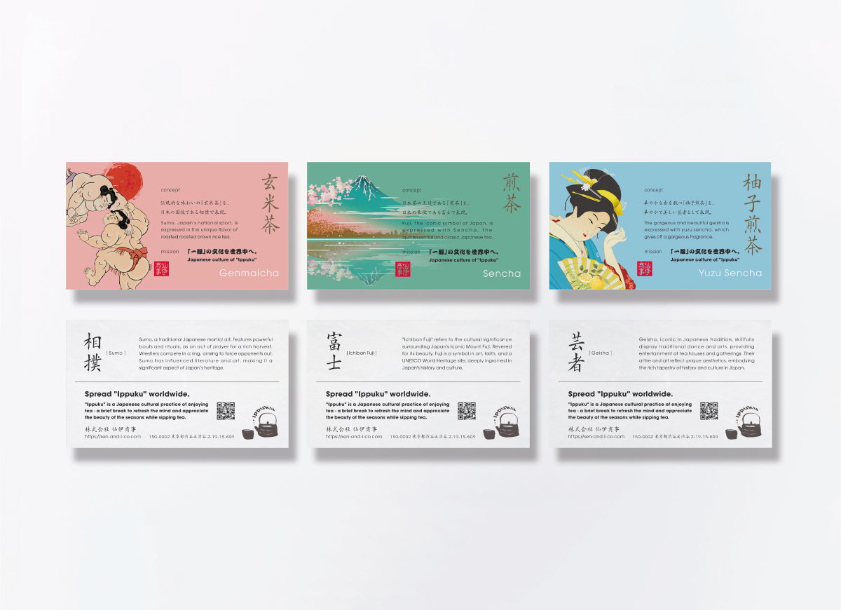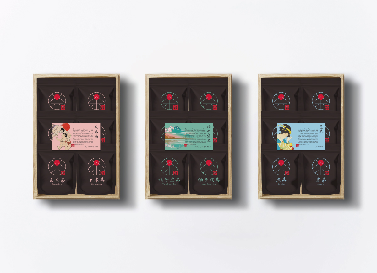 現役東大生の星野社長率いる株式会社仙伊商事がインバウンド向けに開発した日本茶ギフトのパッケージをあめとつちでデザインしました。3種類のお茶それぞれを何度も試飲させてもらい、感じた「お茶のイメージ」を日本のモチーフに置き換えて表現しています。デザインだけでなく商品開発、販売戦略のアドバイジングも協力させて頂きました。どれも本当に美味しいお茶なので世界の様々な方に是非飲んで頂きたいです。
